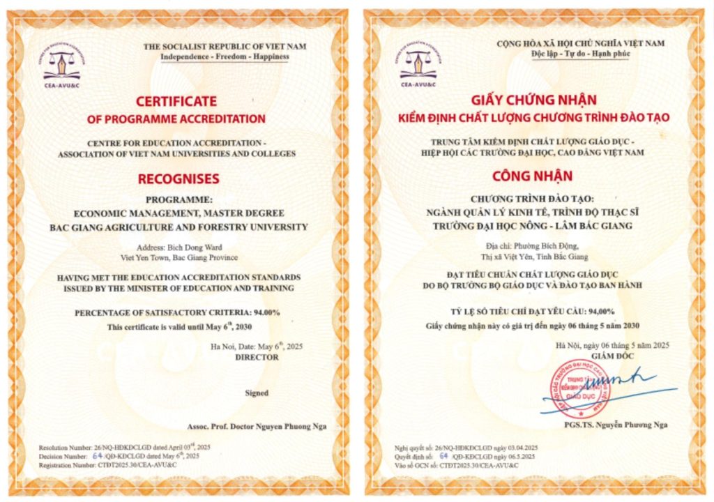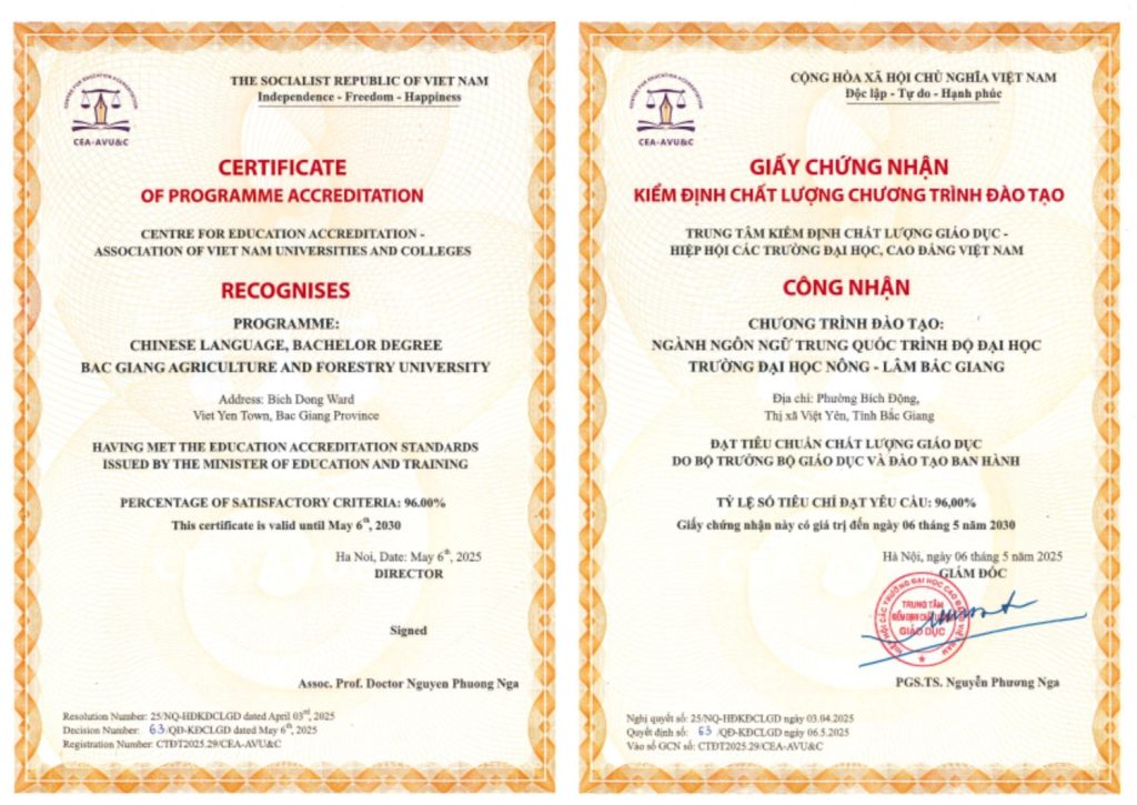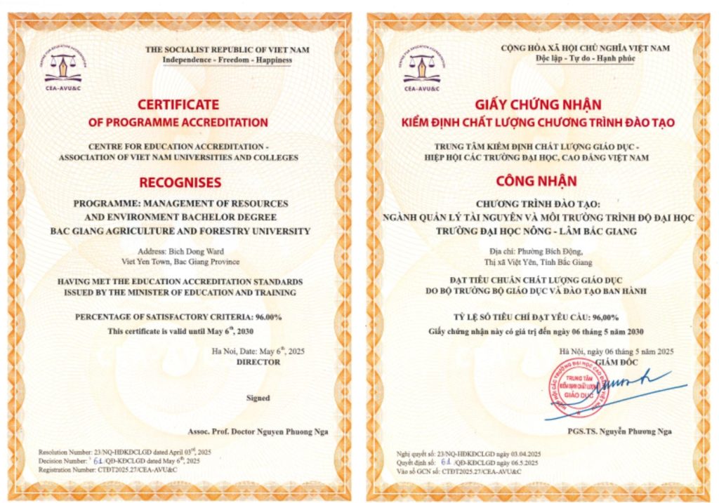 Ngày 06/5/2025, Trung tâm kiểm định chất lượng giáo dục – Hiệp hội các trường đại học, cao đẳng Việt Nam đã cấp giấy chứng nhận công nhận kiểm định chất lượng cho 04 chương trình đào tạo của Trường Đại học Nông – Lâm Bắc Giang. Trong đó, 03 chương trình trình độ đại học gồm Quản lý tài nguyên và Môi trường, Ngôn ngữ Trung Quốc, Bảo vệ thực vật đều đạt tỷ lệ tiêu chí xuất sắc 96%, chương trình thạc sĩ ngành Quản lý kinh tế đạt 94% tiêu chí theo chuẩn chất lượng của Bộ Giáo dục và Đào tạo. Các chứng nhận này có hiệu lực 5 năm, là minh chứng rõ nét cho chất lượng đào tạo của nhà trường.