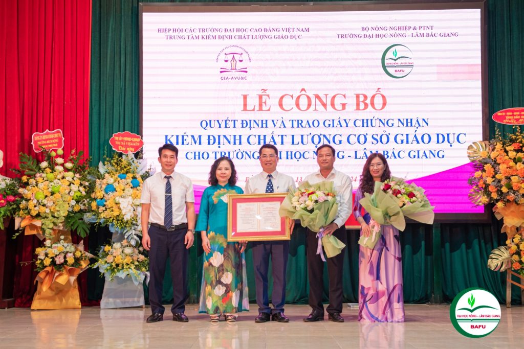 Đại diện Trung tâm kiểm định chất lượng giáo dục (KĐCLGD) – Hiệp hội các trường đại học, cao đẳng Việt Nam trao chứng nhận kiểm định chất lượng cơ sở giáo dục đại học cho Trường Đại học Nông – Lâm Bắc Giang
